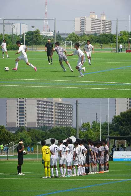 サッカー 堺市総体2 公開日 2024/08/04 更新日 2024/08/04 部活動 試合後半早々に、浅香山中はチャンスを生かし待望の1点を奪いました。しかし、交代要員がいない状況で体力の消耗が激しく、本校のゴール付近での攻防が増えてしまいました。 点差が開く中、お互いに声を掛け合い、最後まで全力でプレーした姿はとても立派でした。