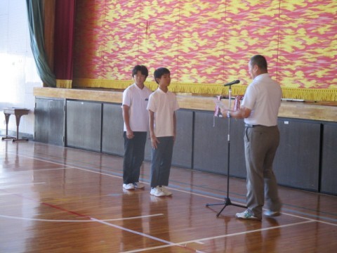 次に、バレーボール部、剣道部男女の表彰を行い、校長、生徒指導主事から話をしました。