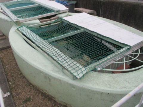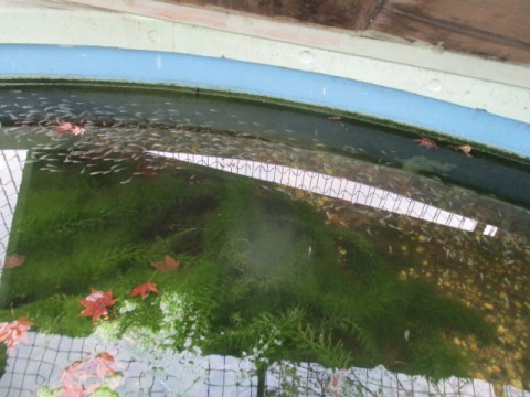 水槽のめだかはたくましく成長し、大群となって泳ぎまわっています。