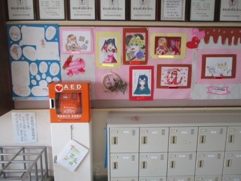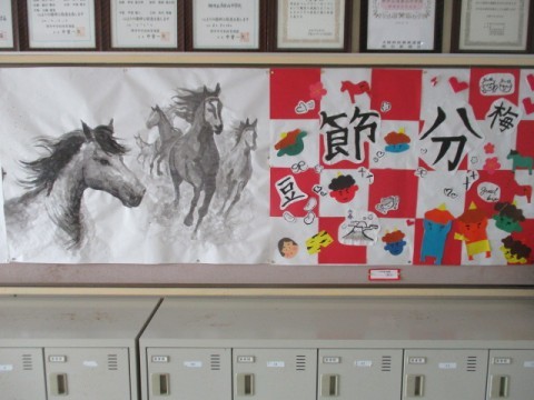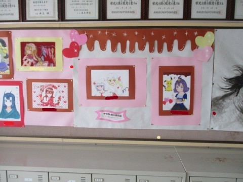 おはようございます。イラスト部・美術部の皆さんが2月に合わせて、季節感あふれる作品を玄関に飾ってくれました。