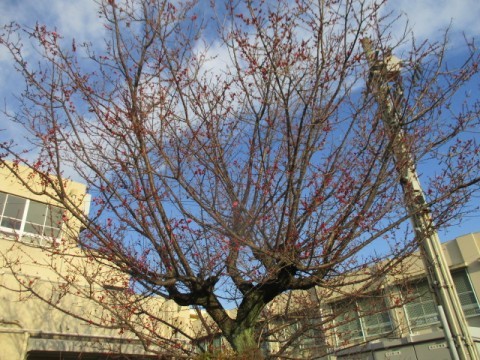おはようございます。校庭の梅の蕾が赤みを増しながらしだいに