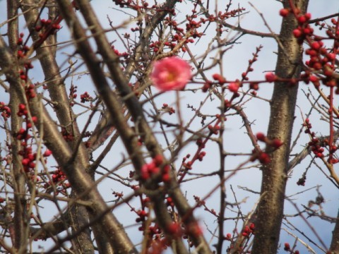 おはようございます。梅の蕾がどんどん赤みを増し、わずかに開花が