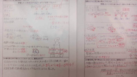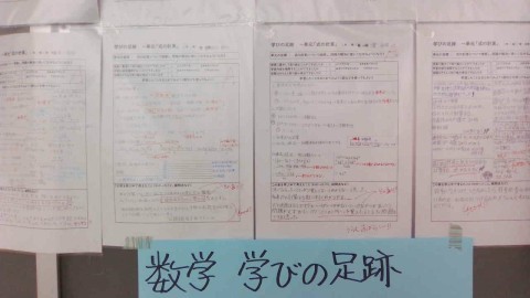2年生スタッフルームの前に、生徒が提出した数学の学びの足跡が掲示されていました。