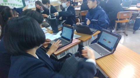 2年生の英語では、1人1台パソコンを使って英語プレゼンテーションの準備をしています。