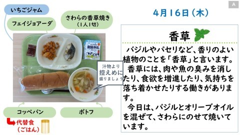 今年度初めてのパンが登場しました。パンに合わせてバジルを使った鰆の香草焼きを組み合わせていました。