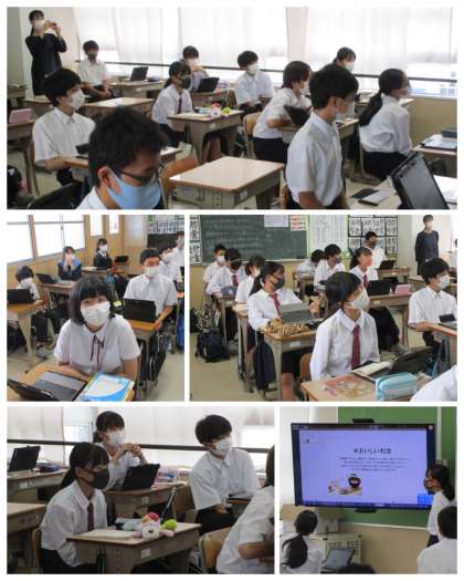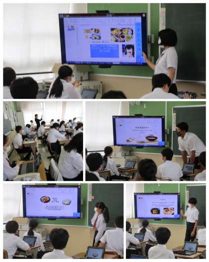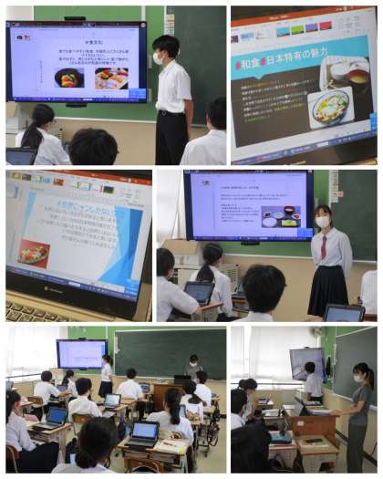 日本食について世界に発信するなら,どんなテーマを考えるか。各個人が考えたことをパワーポイント一枚で発表しています。