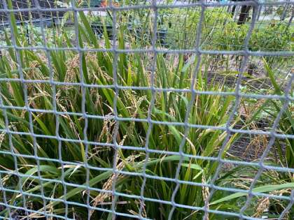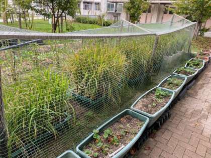 お米ができてきたのでスズメがたくさん来るようになってきました。お米が食べられてしまわないように、校務支援員さんが立派なネットを張ってくれました。収穫まであと少しです。