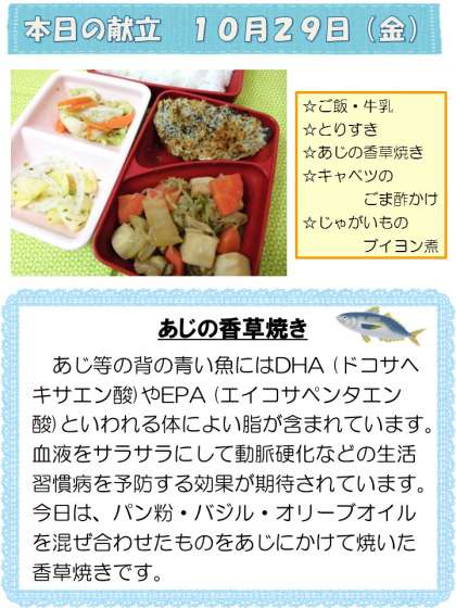 香草焼きは、にんにく・バジル・パン粉・塩こしょう・オリーブオイルをまぶしてオーブンで焼いた料理です。今日は「あじの香草焼き」でした。魚が苦手な人でも食べやすかったようです。