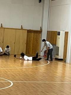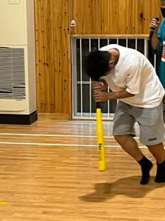 バットを額につけ、周回して、先にある目標の卓球ラケットをめざします