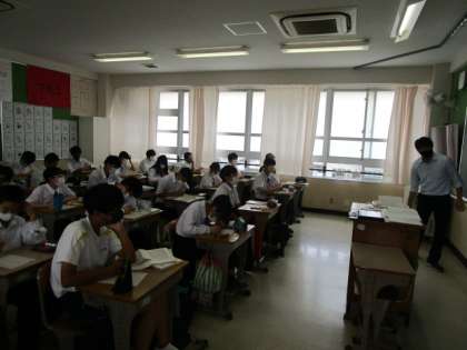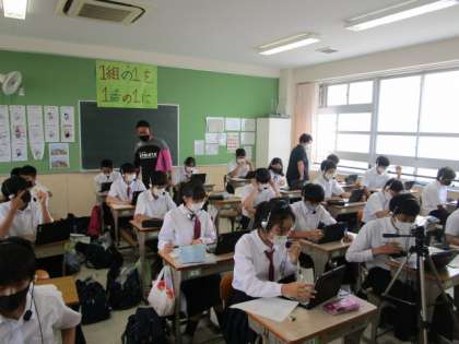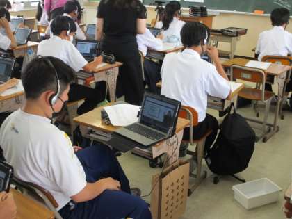今日は,2年生の英語で,オンライン英会話を実施しました。事前に,会話中に使うと便利なフレーズなども学びました。