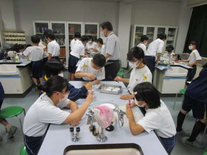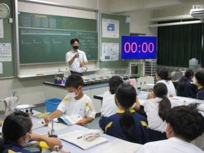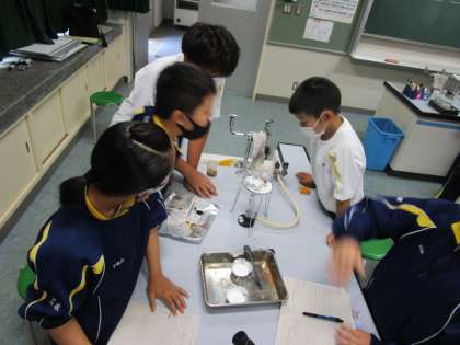 今日は,理科室で「様々な物質の見分け方」で,ガスバーナーを使って焼いて,その反応を見る方法も利用しました。