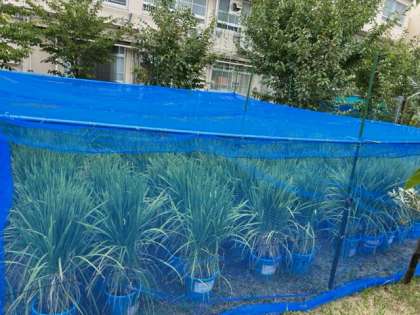 お米がすずめに食べられてしまわないように、技術職員さんがお網を張ってくれました。おいしいお米が収穫できるといいですね。