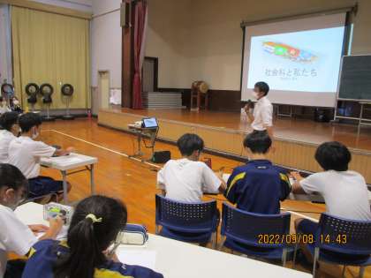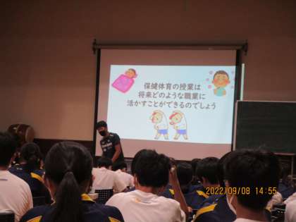 今日は,社会科,保健体育科,家庭科,数学科などの仕事へのつながりについて先生たちからの話を聞きました。