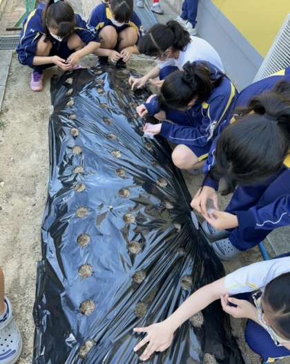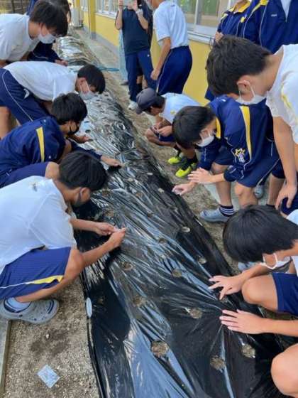 今日は2年1組全員で、なにわの伝統野菜の「田辺大根」と「天王寺蕪」の種を植えました。