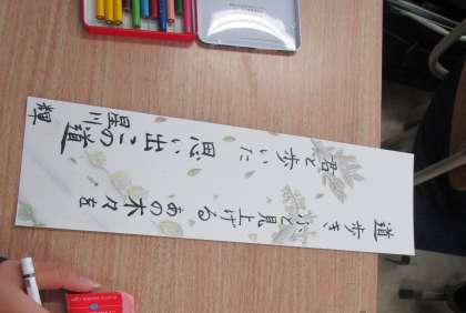 秋をテーマに短歌を作っていました。自分が作った短歌を短冊に筆ペンで字を書いて,挿絵も入れて,「なんて素敵!」と思いました。