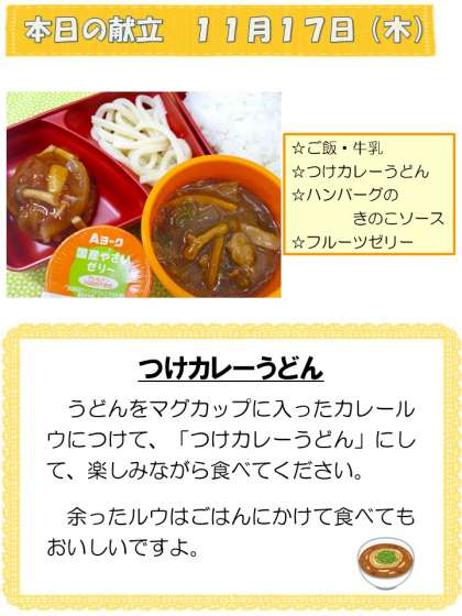 中学校給食では、給食は保温カートで学校に届けられるため、のびてしまう麺類は、あまり出すことができません。そこで考えられたのが、「つけカレーうどん」です。うどんを自分でカレーにつけて食べます。残ったカレーにごはんを入れて食べることもできます。