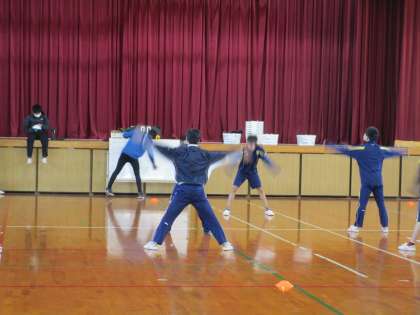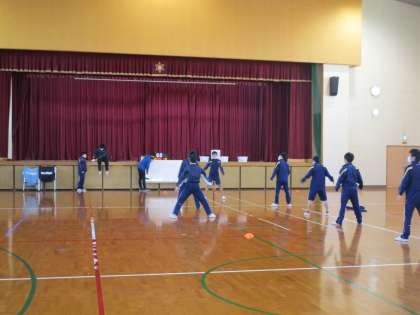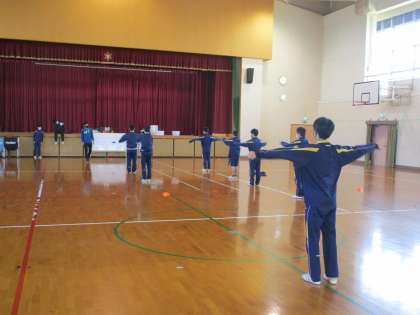 体育館で準備体操をしていました。この後,バスケットボールをします。