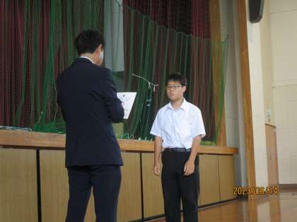 今日は、表彰伝達ができました。泉北地区の大会で、陸上部の生徒が円盤投げで、なんと3位に入りました。