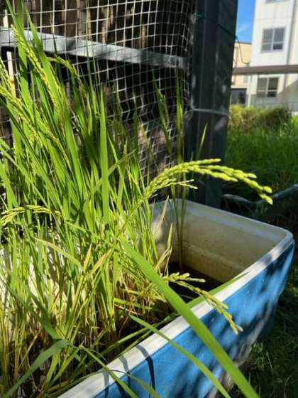 6月に1年生が植えた稲に穂が出てきて、花が咲きました。