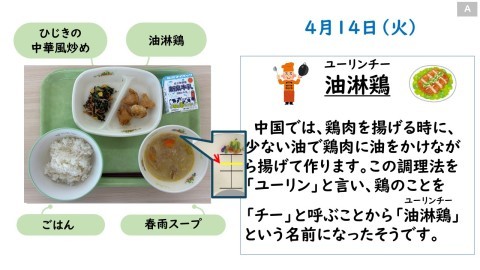 本日4月14日(火)の献立は、ご飯・牛乳・油淋鶏・ひじきの中華風炒め・春雨スープでした。