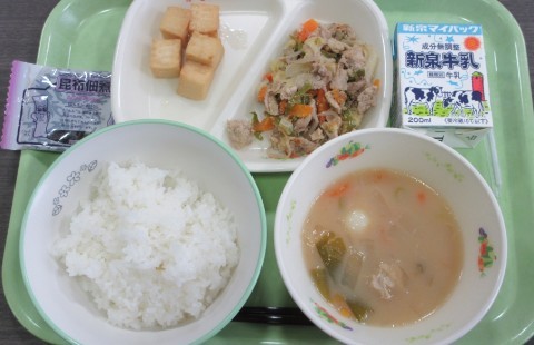 本日4月15日(水)の献立は、ご飯・牛乳・豚肉入り野菜炒め・厚揚げのしょうが焼・だんご汁・昆布の佃煮でした。