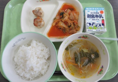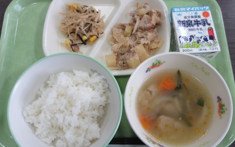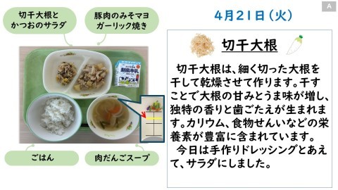 本日4月21日(火)の献立は、ご飯・牛乳・豚肉のみそマヨガーリック焼き・切干大根とかつおのサラダ・肉だんごスープでした。