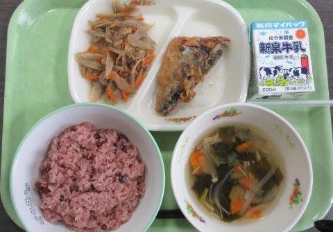 明日4月22日(水)の献立は、ご飯・牛乳・さばの揚げづけ・きんぴらごぼう・すまし汁です。