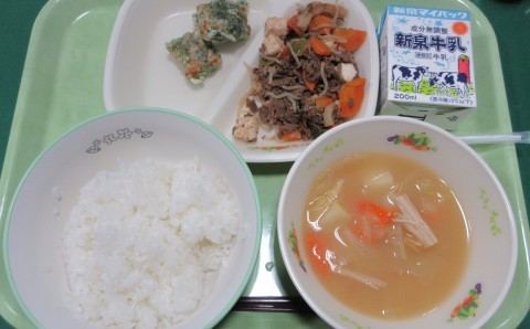 明日4月23日(木)の献立は、ご飯・牛乳・肉豆腐・ちくわの磯辺揚げ・キャベツのみそ汁です。
