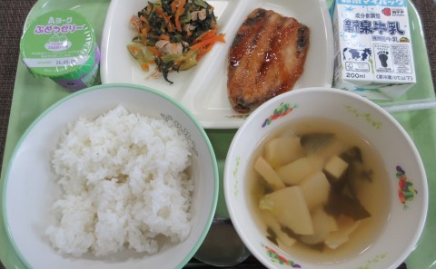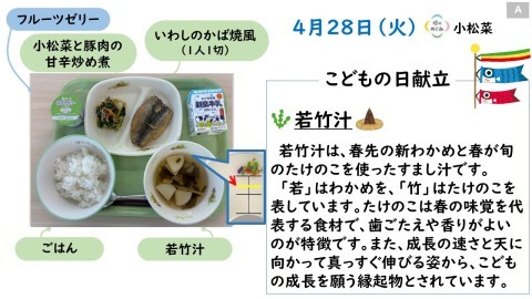 本日4月28日(火)の献立は、ご飯・牛乳・いわしのかば焼風・小松菜と豚肉の甘辛炒め煮・若竹汁・フルーツゼリーです。