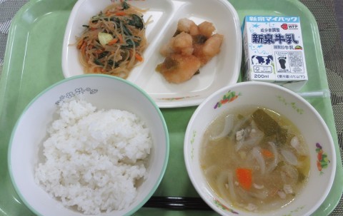 献立は、ご飯・牛乳・鶏肉のから揚げおろしソース・タンタン春雨・中華スープです。