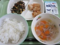 本日4月15日(水)の献立は、ご飯・牛乳・豚肉入り野菜炒め・厚揚げのしょうが焼・だんご汁・昆布の佃煮でした。