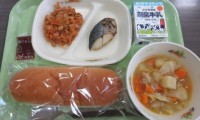 来週4月20日(月)の献立は、ご飯・牛乳・あじフライ・ミートポテト・春野菜スープです。