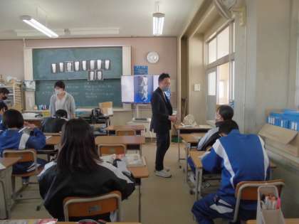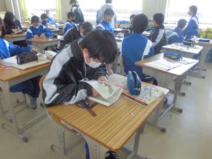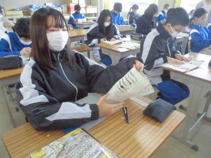 1年2組、美術の授業の様子です。一枚の紙にハサミで切れ目を入れ立体的な形を作り出していきます。今日は練習用紙で行っていました。切れ目を入れていくことでどんな形ができるかチャレンジしていました。保護者の参観もありました。