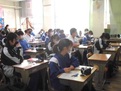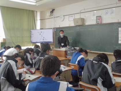 2時間目、2年4組では占部先生の数学の授業が行われました。専門指導員の先生が教育委員会から来られ、授業を見学されました。オープンスクールと重なりたくさんの方の見学となりました。今日の授業のめあては合同の証明です。