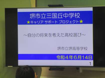 本日6月14日(火)の6時間目に3年生対象に堺高校の先生に来ていただき,堺高校のPRではなく,キャリアサポートプロジェクト「自分の将来を考えた高校選び」と題してキャリア教育を行ってもらいました。