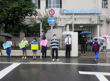 本日の「朝のあいさつ運動」は,担当の生徒と教育実習生,職員で行いました。小雨の降る中,ありがとうございました。明日の朝もよろしくお願いします。