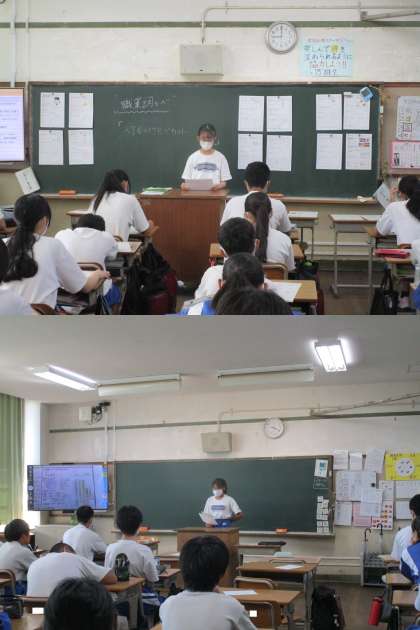2年生は教室内でクラスメイトに職業調べの発表を行いました。発表の後に「先生も実はこの職業になりたかってん」という担任の先生の発言もありました!