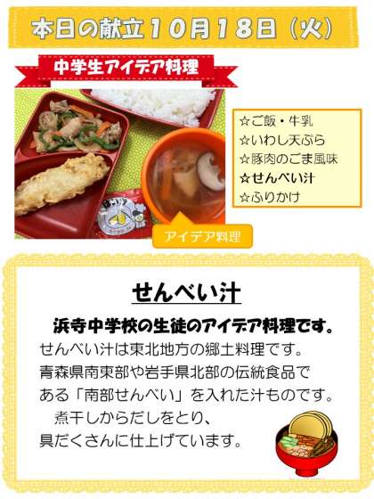 本日の給食メニュー 公開日 2022/10/18 更新日 2022/10/18 学校からのお知らせ エネルギー 764 kcal,たんぱく質 28.7 g,脂質 22.8 g ※ご飯の量が標準の場合の栄養値です。