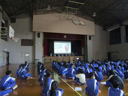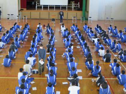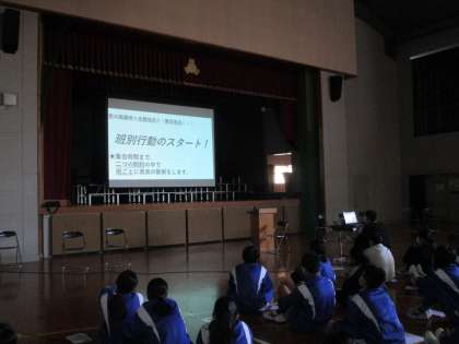 職業調べ発表会に続いて、土居先生より校外学習(奈良公園方面)についての説明がパワーポイントを使ってありました。しっかり計画を立てて、班行動を成功させましょう。