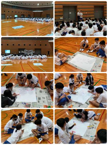 防災学習のワークショップ1を行っています。保護者の方などにも参加頂き、避難所運営図を考えました。