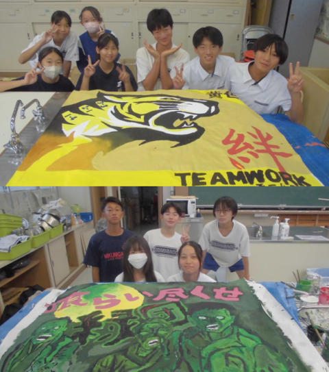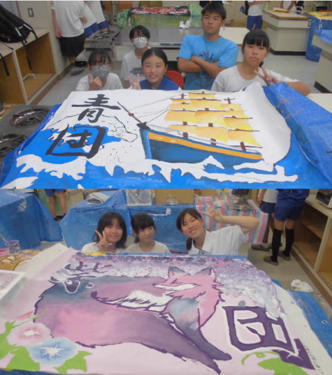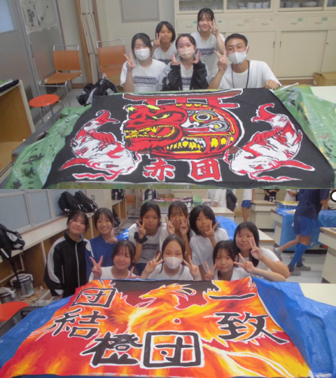 今日は応援団旗の作成がありました。どの色団の人たちも、協力して真剣に色塗りの作業に励みました。