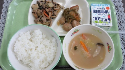 本日4月27日(月)の献立は、ご飯・牛乳・肉団子の甘酢あんかけ・じゃがいものいそ煮・みそ汁です。