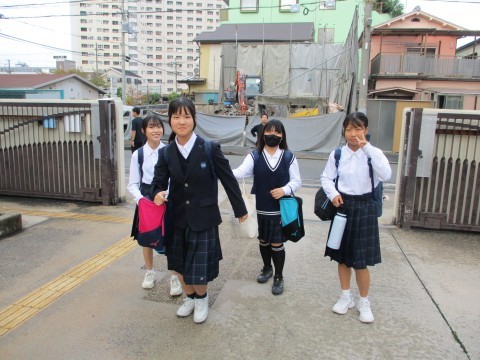 曇り空の月曜日の朝です。今朝の登校の様子です。