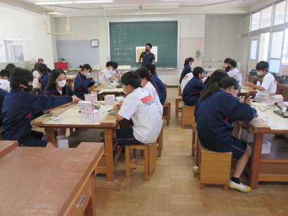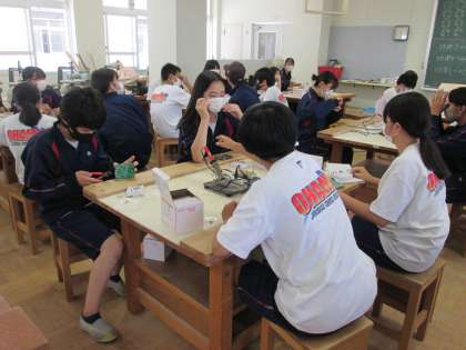 道具の使い方に気を付けながら、はんだづけをしています。