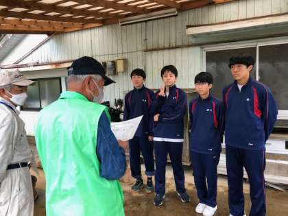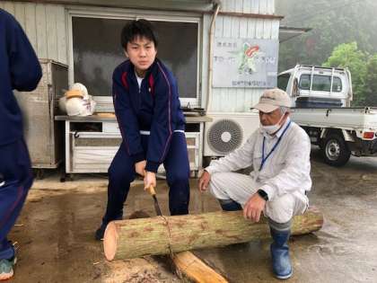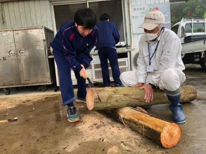 森林間伐の体験は雨天のため、屋根のある場所でヒノキのマルタを切る体験をしました。
