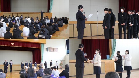 読書感想文コンクールや標語コンクール、サッカー部などの表彰と校長先生からのお話がありました。