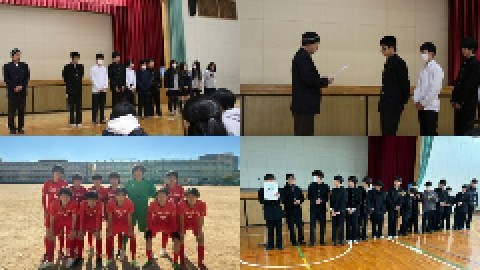 2月の集会では、野球部・サッカー部・バドミントン部、そして堺市連合書初展の表彰を行いました。