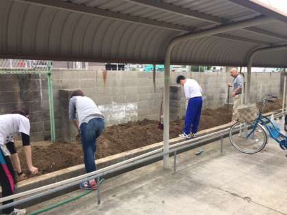 1限目、校長先生も一緒に畑を耕して、トマトやお芋、茄子などたくさん野菜の苗を植えました。大きく育ってくれることを願っています。