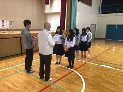 まずはじめは表彰です。5月4日に行われた堺市種目別大会で団体優勝したバドミントン部が表彰を受けました。団体以外もシングルスで竹田芽生さんが優勝、田中さんが第3位、ダブルスでも竹田のどかさん北西さんペアが優勝と全ての優勝カップを独占する見事な結果となっています。よく頑張ってくれました!