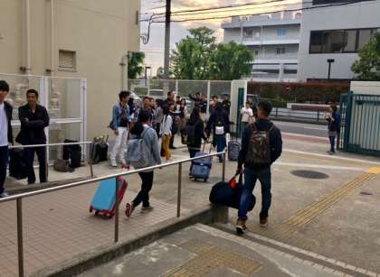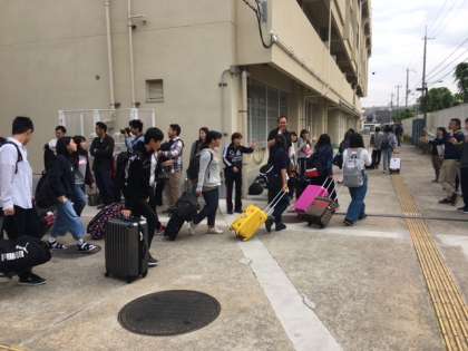 出発式が終わって1組から順に、バスが停まっている正門まで移動しています。大きな荷物ですが、皆とても嬉しそうな表情です。
